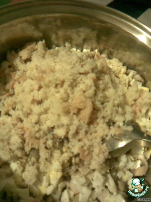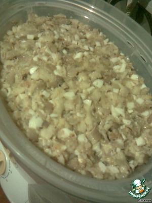 Соединить остывший лук, яйца, грибы, соль, перец. Замоченный ранее батон отжать и покрошить к грибам.