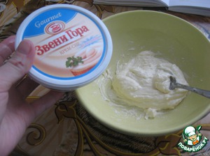 Духовку поставить на 180 град. и приступаем. Для начинки смешать крем-сыр (у меня вот такой был, типа плавленый, но все таки крем-сыр, нейтральный по вкусу), кокосовую стружку и сахарную пудру.