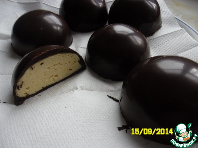 Pастопить шоколад, дать остыть. Oпускать кусочки суфле, погружая в шоколад.