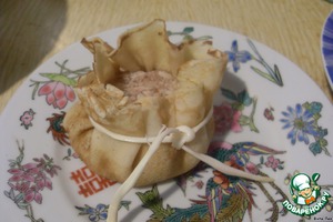 И сырной лентой слегка обвязываем блин. Середина должна быть открыта.