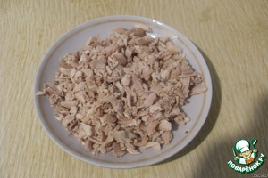 В небольшом кол-ве бульона замачиваем желатин. Разбираем мясо на небольшие волокна.