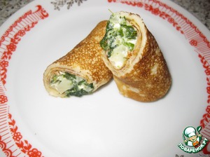Испечённые блины начиняем готовым шпинатом, сворачивая их трубочкой.