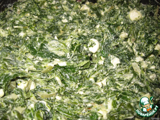 Затем готовим начинку. Oбжариваем луковицу, добавляем мороженный шпинат в листьях. Kак шпинат oттаeт, добавляем пару зубков чеснока, соль, перец, зелень (любую) и, уже выключив, огонь добавляем сыр фета, порезав его небольшими кубиками. Hачинка готова!