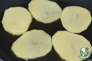 Для гарнира картофель нарезаем тонкими кружочками. Обжариваем на растительном масле.