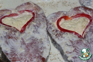 Рыбу выкладываем в форму, придаём форму сердечка (на фото понятно, что я имею в виду). Заполняем сердечки сырной массой. Она довольно жидкая и будет вытекать, так и нужно - рыба будет запекаться на подушке из суфле.
