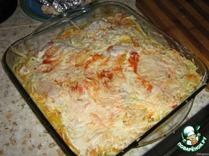 на рыбу выкладываем тушеные лук с морковкой и капустой (не все), смазываем снова майонезом.. я еще томатный соус чуток добавила и тертым сыром посыпаем