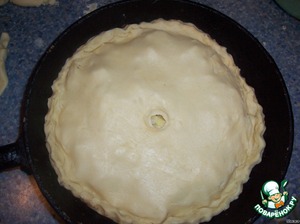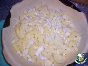 Одну часть раскатанного теста выкладываем в форму (у меня большая сковородка) и раскладываем начинку №1