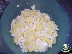 1 вариант - картошку нарезать брусочками, капусту нашинковать, вареное яйцо нарезать, посолить, добавить ложку майонеза. -