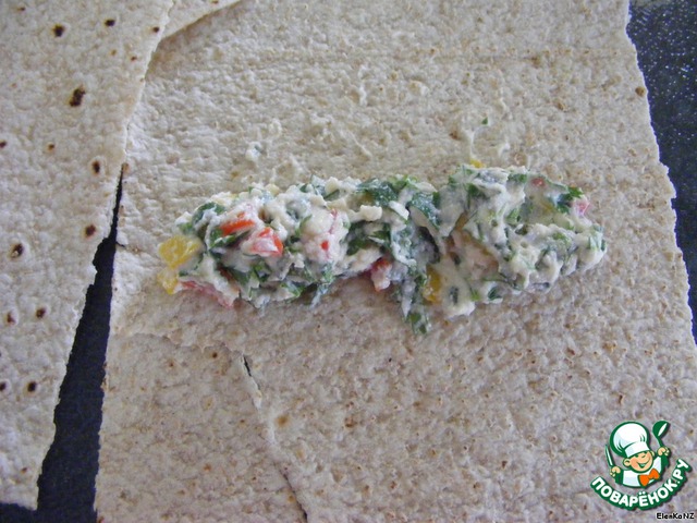Я сделала рулетики из лаваша. Лист лаваша разделила на 4 части, положила начинку и скрутила в рулет. Дать время, чтобы лаваш пропитался от начинки, и можно подавать.
