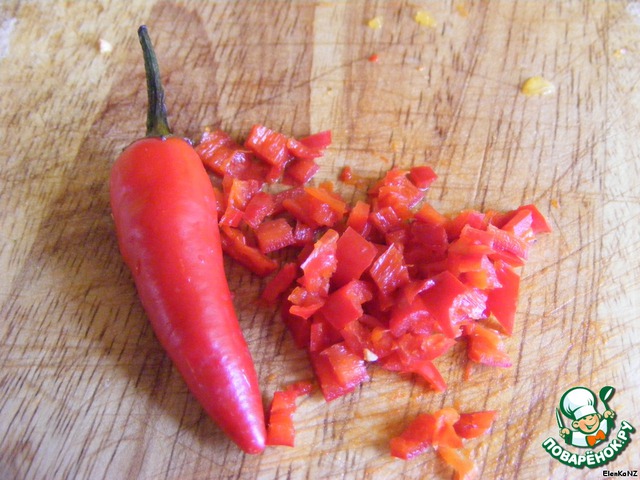 Сладкий перец и чили режем мелкими кубиками, предварительно убрав семена из чили.
