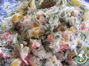 В рикотту добавляем обжаренный перец, кинзу и все перемешиваем.