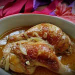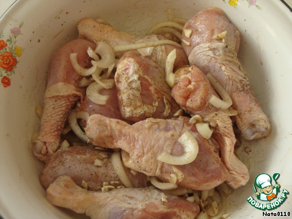 Кусочки курицы выкладываем в ёмкость, посыпаем нарезанным полукольцами луком, измельченным чесноком, приправами.
