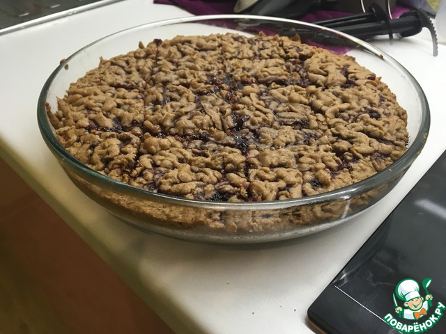 Пекла, используя силиконовый противень. Просто размяла большую часть теста, ту, которая была в холодильнике, равномерно распределив по противню. Сделала небольшие бортики. Равномерно намазала нижний корж вареньем.