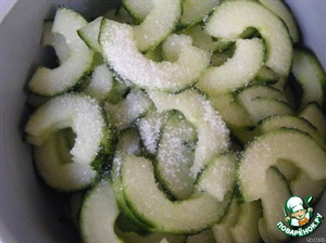 Огурец разрезаем пополам, вынимаем семена (она нам не пригодятся, поэтому съедаем!) Режем на кусочки и кладем в тарелку, засыпаем сахаром и солью. Оставляем на 30 мин (по рецепту 1 час)