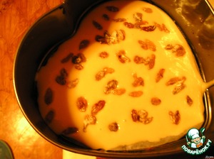 Приступаем к коржам. В форму, застеленную пергаментом, выкладываем орехи и сверху тесто.