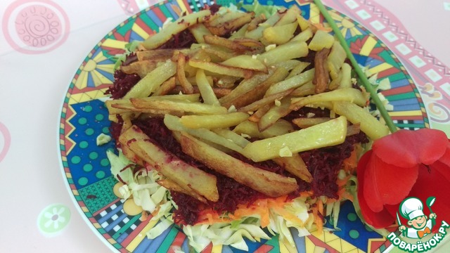 Капусту шинкуем тонкой соломкой. Морковь, свеклу и картофель натираем на терке для корейской моркови. В капусту добавляем морковь и свеклу. Картофель обжариваем небольшими порциями в подсолнечном масле (получается хрустящие чипсы) и выкладываем в овощи. Чеснок необходимо порубить соломкой, очень тонко. Последнюю порцию картофеля выливаем вместе с горячим маслом. Это придаст салату мягкость. Посолить по вкусу.