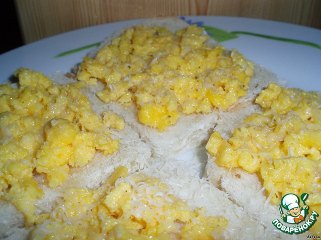Растопленное масло и яйца перемешать, поставить в печь на полную мощность примерно на 1,5-2 минуты, помешав один раз.