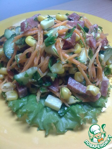 Солить салат и добавлять какие-либо специи не нужно - корейская морковка и сервелат сами по себе достаточно пикантны.