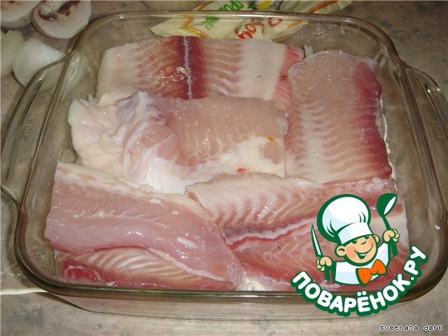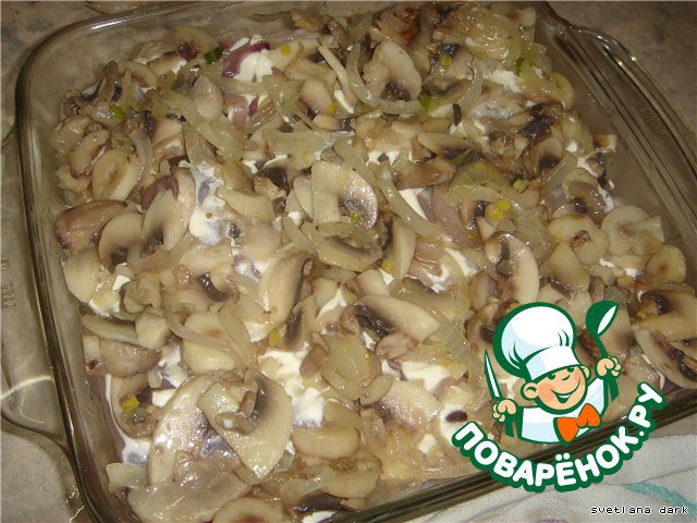 Грибы обжарить с луком и выложить на рыбу, полить майонезом.