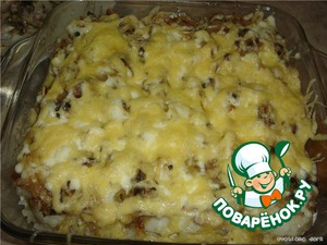 Поставить в духовку на 15 мин., посыпать сыром и запекать еще 5 мин. в духовке (или микроволновой печке) при t 200 гр.