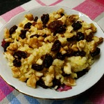 Кашу выложите на тарелку, украсьте маслом, измельченными орехами и изюмом.