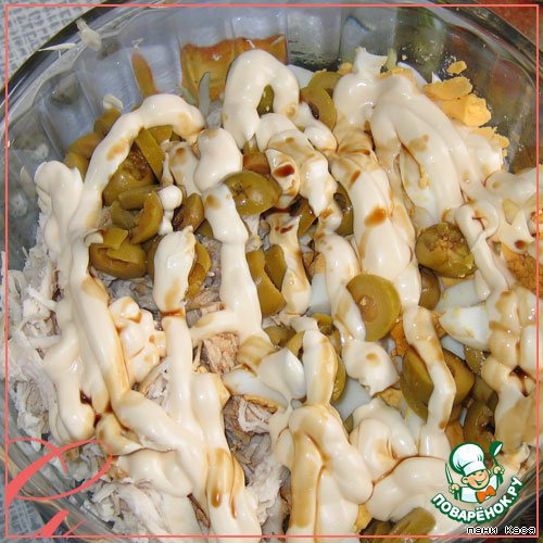 Смешать капусту, курицу и нарезанные произвольно яйца