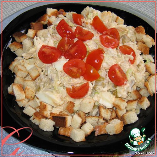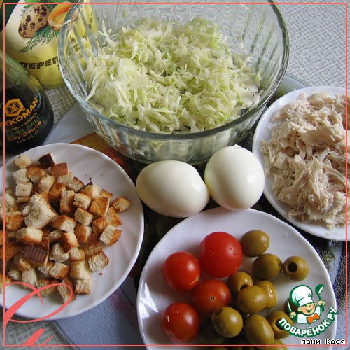 Яйца сварить вкрутую, капусту пошинковать, помять с солью. Курицу нащипать на волокна. Сухарики насушить из белого хлеба.