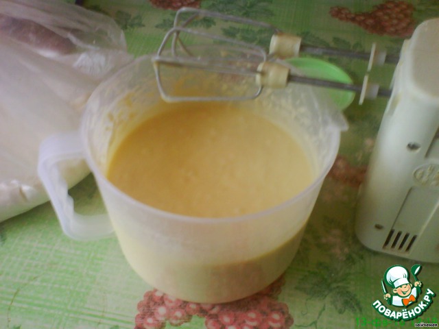 Смешиваем сметану, яйца, сахар, сгущенку, муку, взбиваем и добавляем соду. Тесто получается жидкое