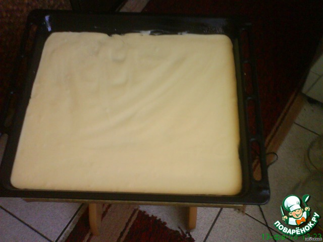 Делим тесто на 2 части (примерно на глаз), одну часть выливаем на смазанный маслом противень и ставим в уже прогретую духовку, при температуре 180 градусов, на 6-9 мин.