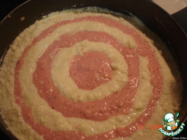Начинаем укладывать творожную массу из корнетика (я торопилась, укладывала ложкой), от середины до края, чередуя цвета.