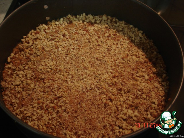 Печенье перемолоть, добавить сгущенку, хорошо перемешать, уложить в форму (разъемную), присыпать орехами