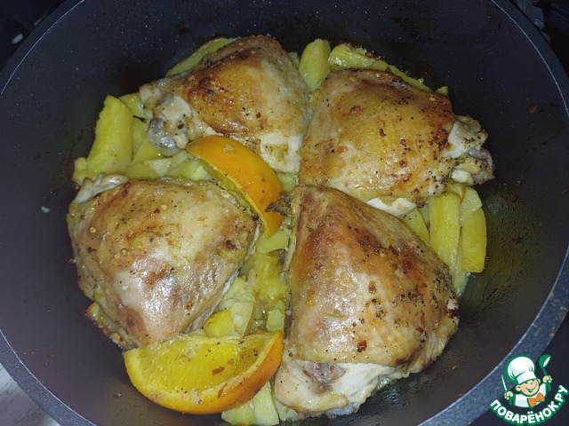 Форму смазать маслом, выложить картофель. Посолить, поперчить. Выложить сверху на картофель ломтики апельсина. -
