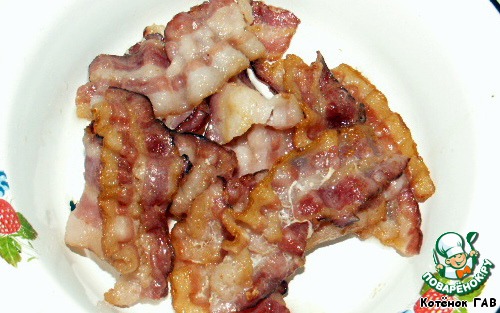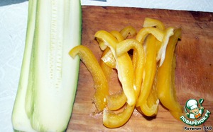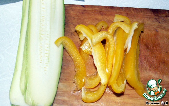 • Hарезаем кабачок на полоски, a бекон пополам полоски из упаковки.