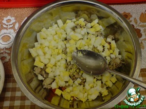 Вареные яйца можно натереть на крупной терке, можно нарезать кубиками. Все смешиваем в миске. Солим и тщательно перемешиваем.