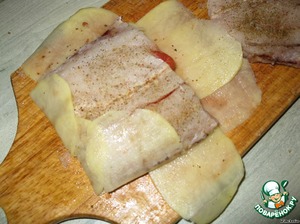 Картофель очистить, нарезать очень тонкими пластинками (прозрачными) можно картофелечисткой - у кого есть с широким лезвием. Разложить картофельные пластинки внахлест. Поместить на них кусочки филе.