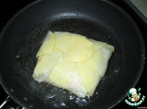 Кусочки филе завернуть в картофельные пластинки полностью.