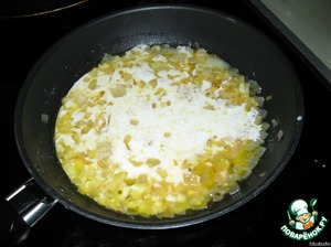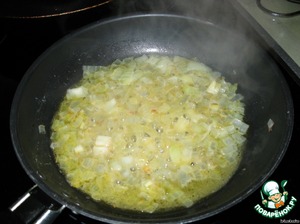 Готовим соус: лук нарезать и поджарить 2 минуты на сливочном масле. Добавить белое вино и выпарить его еще 2 минуты.