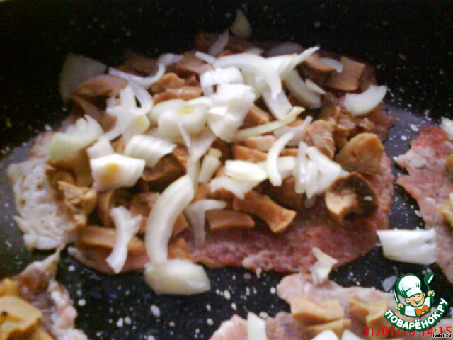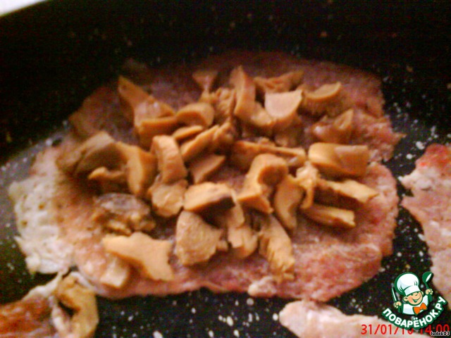 Мясо положить на противень порезать на небольшие кусочки грибы и выложить их на мясо.