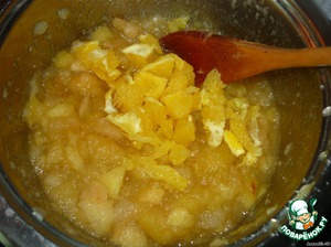 Апельсин очистить, измельчить и добавить к яблокам. Засыпать сахар и тушить помешивая еще 10 мин.