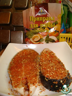 Рыбу надо замариновать в лимонной приправе для рыбы. Оставить приблизительно минут на 10.