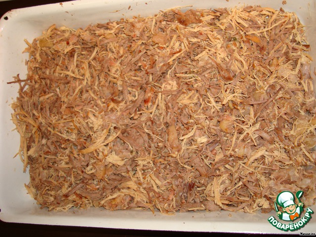 Переложить мясную массу в форму. Влить бульон. Остудить, затем поместить в холодильник до полного застывания.