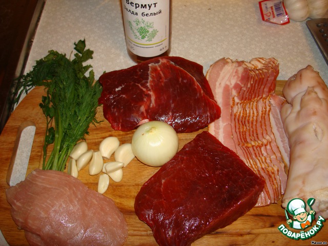 Положить в кастрюлю свиную ногу, бекон, зелень, лук, чеснок и три вида мяса. Влить вино или вермут и воду. Варить на медленном огне 4-5 часов.