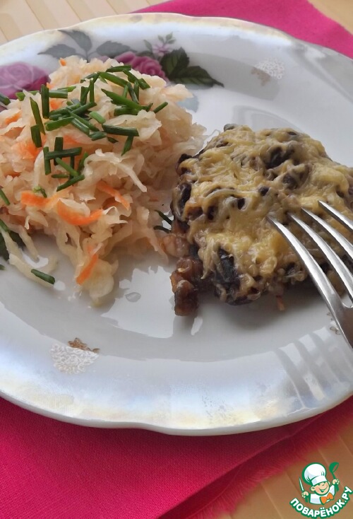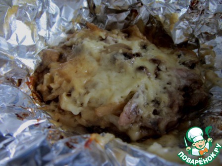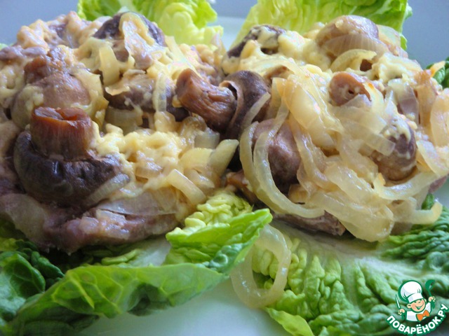 Обжариваем шампиньоны и нарезанный лук, слегка солим. Выкладываем на мясо грибы с луком.