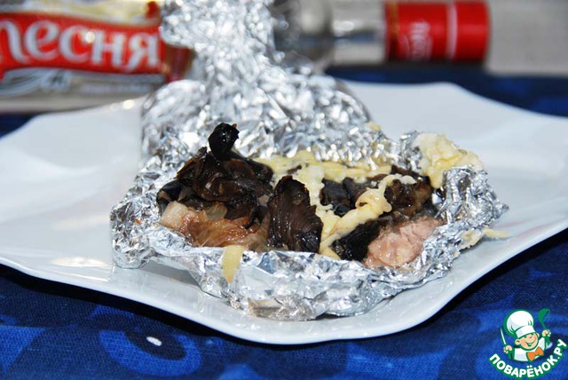 Мясо нарезаем (кусочками примерно по 100г), отбиваем, я отбиваю ножом. Солим, перчим по вкусу. Кладем каждый кусок на фольгу, оставляем большие края, чтобы потом можно было завернуть.