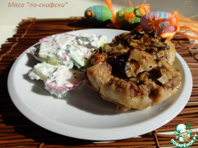 Мясо по этому рецепту приготовить очень быстро: минимально обработать продукты, завернуть в фольгу, положить в духовку … дальше все запекается само. Получается нежно, ароматно, вкусно. Подозреваю, что к скифам этот рецепт не имеет отношения, но под каким названием мне он стал известен, под таким предлагаю его и Вам.