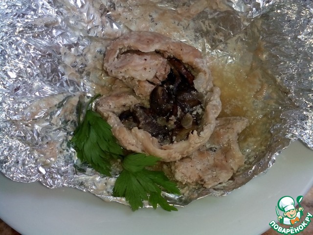 Поливаем каждый кусок столовой ложкой сливок. Сверху можно натереть немного сыра, но это по желанию. Далее поднимаем края фольги и заворачиваем, получается что-то типа узелка. Складываем их на противень и запекаем в духовке около 40 минут.