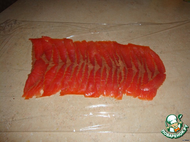 На пищевую плёнку выложить внахлёст кусочки рыбы. Приправить перцем.