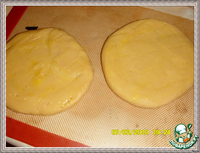 Каждый раскатываем в круг толщиной 0,5 см, смазываем растопленным топленым маслом. В центр кладем масляный колобок.