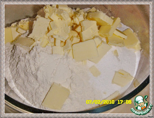 Растираем руками 175 гр неразмягченного!!! топленого (добавляла сливочное) масла с 150 гр сахарной пудры и 2 стаканами муки, чтобы получилась маслянистая сладкая крошка. -