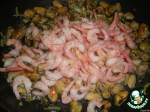 Добавляем мидии, накрываем крышкой и тушим буквально 1-1,5 минуты.